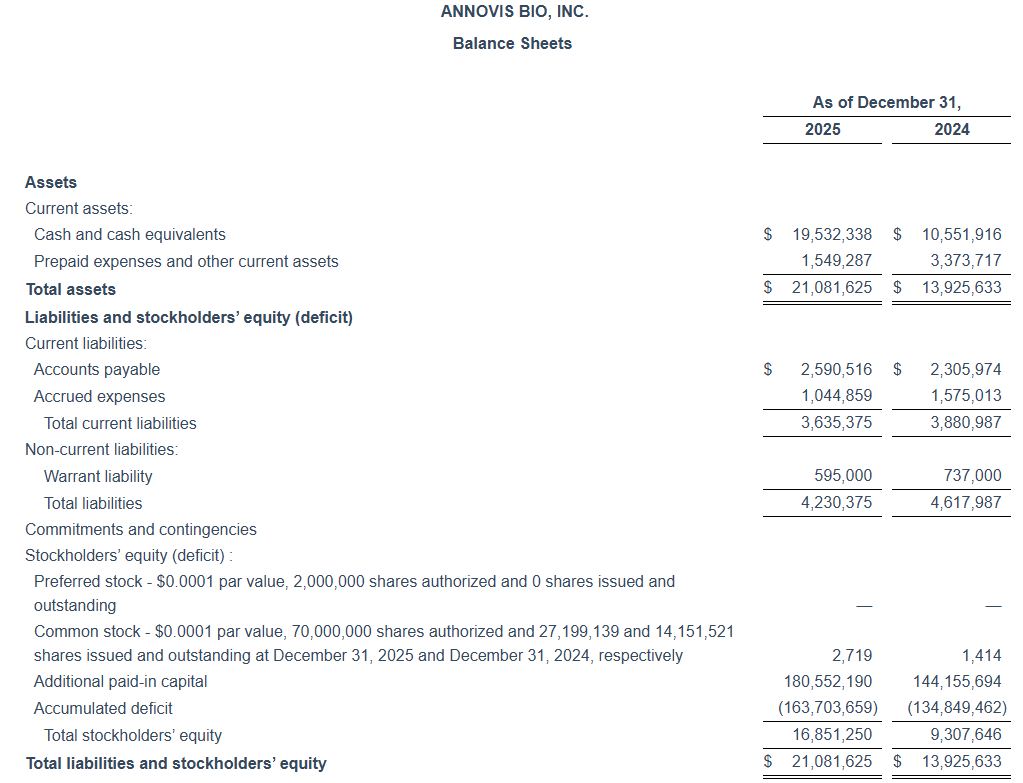 Annovis’ cash and cash equivalents totaled $19.5 million as of December 31, 2025 compared to $10.6 million as of December 31, 2024. The Company estimates that its current cash and cash equivalents, including proceeds from its stock offerings in the fourth quarter of 2025, will enable it to fund its operations into the third quarter of 2026. The Company had 27.2 million shares of common stock outstanding as of December 31, 2025.